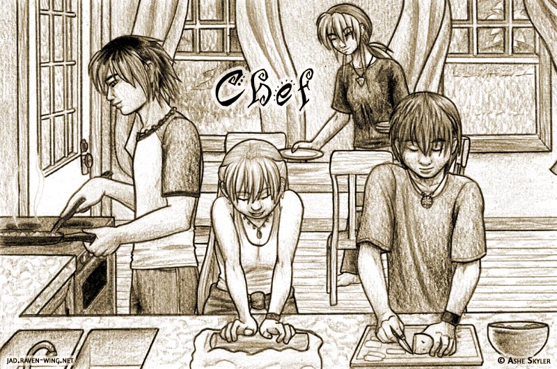 The kitchen curtains fluttered gently in the warm spring breeze, tickling Shanku's arms as she passed by while setting the table. Katari was at the stove and softly humming as he fried up beef tips. Ina was rolling out dough to line the pan with. Hilael was beside her cutting up vegetables to go into the pot pie they were all working on (except Shanku), and soon to begin dicing fruit for the side dish. Shanku had been booted out of meal prep except for in the case the rest of them were sick, and even then she was under strict orders to serve simple pre-prepared things that had minimal margin for error. She could not contain her curiosity or impulses and often over-seasoned, under-seasoned, added strange seasonings, paired unusual dishes, and generally was unpredictable chaos in the kitchen. It was much safer for all parties involved to leave her in charge of setting out and cleaning up dishes.