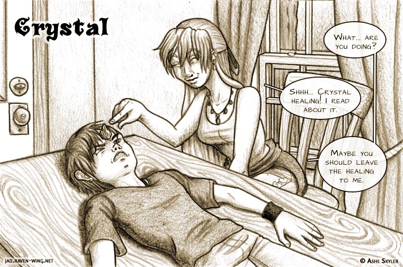 "Shhh," Ina shushed him and carefully adjusted the shiny rock on his forehead. "Crystal healing! I read about it."