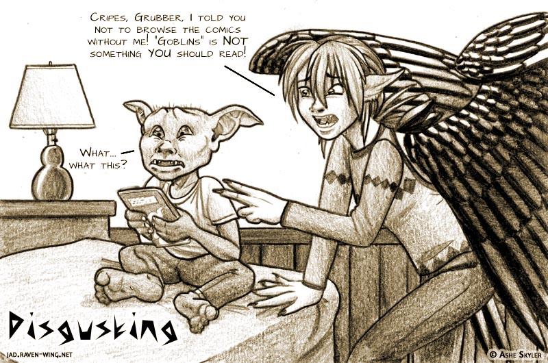 I tossed around a few ideas for this one. Katari explaining to Niku what was in Sylvan sausage and kind of hitting all the checkboxes for his dietary taboos. Hilael mixing herbs as Katari, Shanku, and Ina quivered in fear before it being applied to them. Ina or Katari choking down one of Hilael's blood-restoring salads. Shanku fully realizing that she sank her teeth into a ghoul's asshole. Then another idea came to mind of Modern JAD and if kindly little Grubber came across something brutal like Goblins. I really enjoy it, but, dang, does it get gruesome sometimes, and I'm not just talking about the blood. I can also see now why Hawk once said that JAD moves relatively quickly for a webcomic.