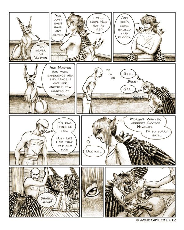 Shanku's grief turned to anger as she remembered the bodies of her friends. She could nearly smell their blood again, see in intrinsic detail every wound, every bruise, every piece of ripped clothing. She felt a rage she had never known spread like fire through her body and begin to change her. Her eyes shot up in an instant and she grabbed Maston's arm with a clawed hand as he nearly struck her.