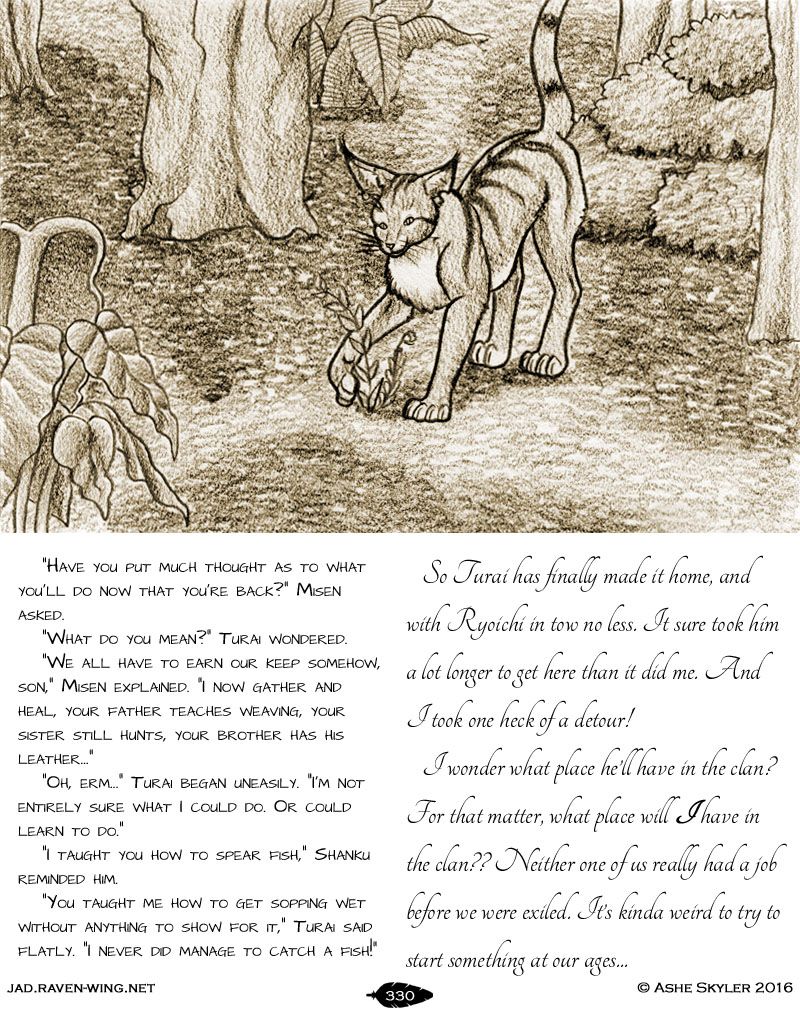 I wonder what place he'll have in the clan? For that matter, what place will I have in the clan?? Neither one of us really had a job before we were exiled. It's kinda weird to try to start something at our ages...