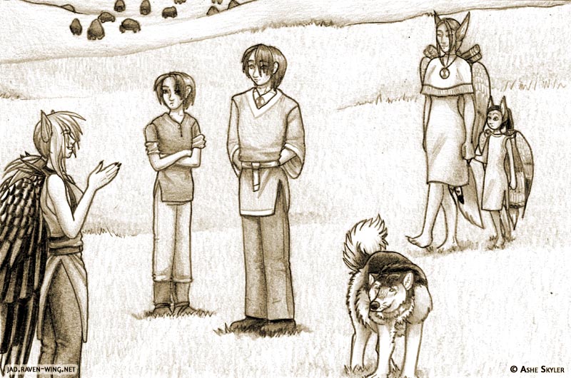 Their journey went smoothly as they travelled through the Nyre and across the plains. They often stayed aloft after they left the forest. Shanku kept a sharp eye out for any signs of the urych or the Heyen, and before long she spotted them. She beckoned to her little group and steered them toward familiar old faces.