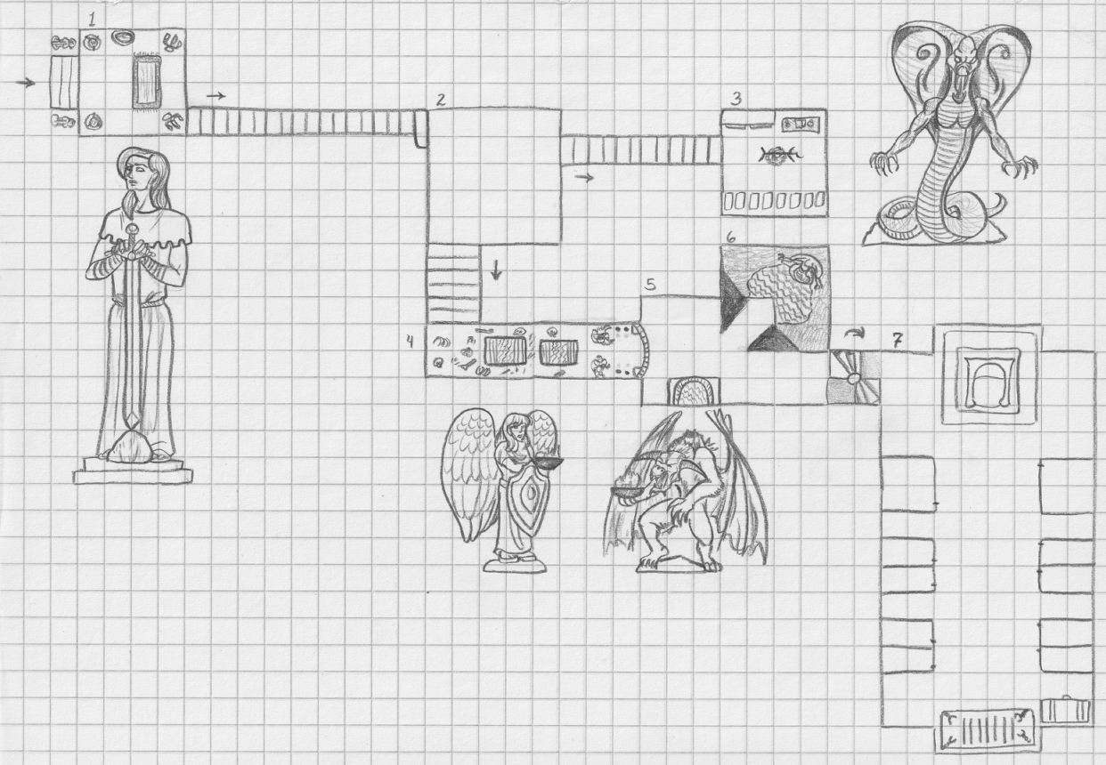 It has no door as it rotted away years ago. The steps lead into a dark room guarded by two statues outside. (DC 16 Knowledge Religion or History to recognize at as an 9h century representation of Nythius, God of Nature and Seasons.) Inside, there are two low burning braziers that are always lit with no sign of who lit them. In the back there are two candelabras that are also burning with candles that never burn down. There are footprints in the thick dust from the halfling and his companions. On the left there is small basin on the wall filled to the brim with water. In the center of the room sits a large, heavily decorated table in surprisingly good shape sitting atop a rug.