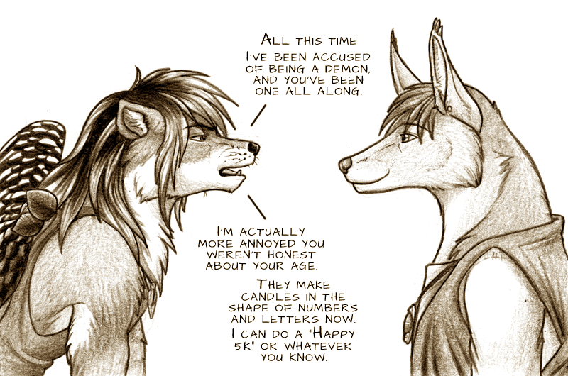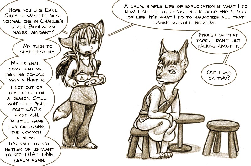 As for Shanku visiting [hell], that depends on whether it is Shanku or meta-Shanku. The JAD world does not at this time have a dedicated [hell], or "plane of evil" or "realm of eternal suffering". My Norse interests have been flaring lately and my D&D memories are waning, so in their terminology, there is the material/common plane Midgard, feyfolk on an Alfheim, an intermediate and combined Helheim and Niflheim where the dead rest or recover or punish themselves before being reincarnated or moving on, and then of course a combined Asgard and Vanaheim where the self-aware bits of energy and personality gather as they guide the mortals of Midgard. Shanku will visit Helheim only when her current mortal shell perishes, and then be returned again to Midgard. Perhaps in the industrialized society variant of JAD I'm goofing off with and then will make future canon just to mess with my readers. ;) Shanku also accepts limitations to her Wanderlust. She's already considered the possibility that she could follow the fey to Alfheim, however, understands that as a Midgardian it is not her place to walk that world, and will not enter it. She is content to explore only Midgard since that is where her current life is set, and life should not be wasted attempting to force yourself into a different incarnation before proper time. Asgard is equally off-limits in this incarnation and she has not achieved the necessary frequency to walk amongst the "gods", but may someday, so she is not concerned with trying to travel to that plane yet. Perhaps a future life will allow her to come back as a fey of Alfheim, but that is for a different time, and as she will have to pass through Helheim many times during the cycle there is no need to rush the matter and explore it before she dies. Energy is energy. Why wouldn't it be plausible for her to be a fey in the next incarnation? (Locals of the JAD world think it impossible, but she doesn't argue with them.) Auric certainly seems to have chosen his most recent incarnation into [the plane he canonically originated from], because he otherwise is very ill-suited to it. [In response to Auric accusing Shanku of being dishonest about not revealing the moniker "Black Plague" when he revealed his canonical plane of origin.] There is no dishonesty in "Black Plague" as that is an insulting name applied to her during a time she was held hostage, and typically shares tales of her time with the pirates if asked. Depending on how bitter she's feeling, she may share the name to drive in the point how much she disliked Captain Dodger. If she declared Auric as the Golden Dingbat, would he then be obligated to announce himself as such to every person he met? Nah. She is rather honest about what she is, a kurach, when it is prudent to do so, which I'm sure Auric can relate to. Shanku and Auric are frequently polar opposites, and is probably where much of the friction and condescension between them lies. Or rather, why Auric frequently expresses contempt for Shanku and considers her inferior and often fantasizes about "teaching her a lesson", whereas she is mostly fine with whatever he actually is and thinks he could stand to brood less. Relationships can change in the blink of an eye and she's already accepted the possibility of being used, discarded, or betrayed as is the nature of interaction with other beings, especially those that appear to dislike you. Despite any illusions of the past, present, or future, all you've really got is what's in the moment and Auric in the moment of interaction has usually been somewhat friendly, so her current basis for their relationship follows the template of "friend(ish) until further notice". Labels create order yet labels also create chaos when people get too caught up in labels. Not once has she assumed all deceivers to be slick-haired salesmen or all "demons" to be evil, or all those declared to be evil to actually be evil. Unlike the Abrahamic faiths that believe speech is the most powerful thing of all, Shanku believes words are soft and not-absolute. His designation may be "demon" but that is based on where he is born and not what he, at his core, is. A true "demon" as what society accepts as a "demon" would have never sought a path to enlightenment, so why should she automatically shun him because he wasn't born/spawned in the "right" place? Age is yet another label that can cause disorder, but friends often like to share particular labels as part of the bonding process, and she was content to perform a common social ritual as accurately as possible as predefined by social custom. Requesting his exact age in a private setting between the two of them was her way of showing that she does not condemn him for being a daemon of deception or what he had to do to survive before his escape/enlightenment, nor wish to out him, and that he is welcome to simply be around her without having to fear a plot, scheme, or other serious backlash or consequences, and that if he wants his cake done correctly then she needs basic data to do it correctly. If he doesn't want to share data or just keep it to the simple celebration of his life as Auric (the past seven years), he can simply say that he doesn't wish to, and she'd let it be, and then offer some tea and cake as he caught up on some reading or meditation and she practiced her katas. Sometimes a cigar is just a cigar and not a euphemism, pretense, or anything requiring overly-complex thought. As a deceptive demon, she already knows that the cake is always a lie, but it was worth asking once to see what truths he wished to share or believe. Meta-Shanku can, as a rule of a meta character, visit other worlds in other universes, but as she has never been used in a roleplay setting or even left the realm of illustrations and comics, it would be odd and uncomfortable. Meta-Shanku also promises to send an extra-special birthday cake this year.